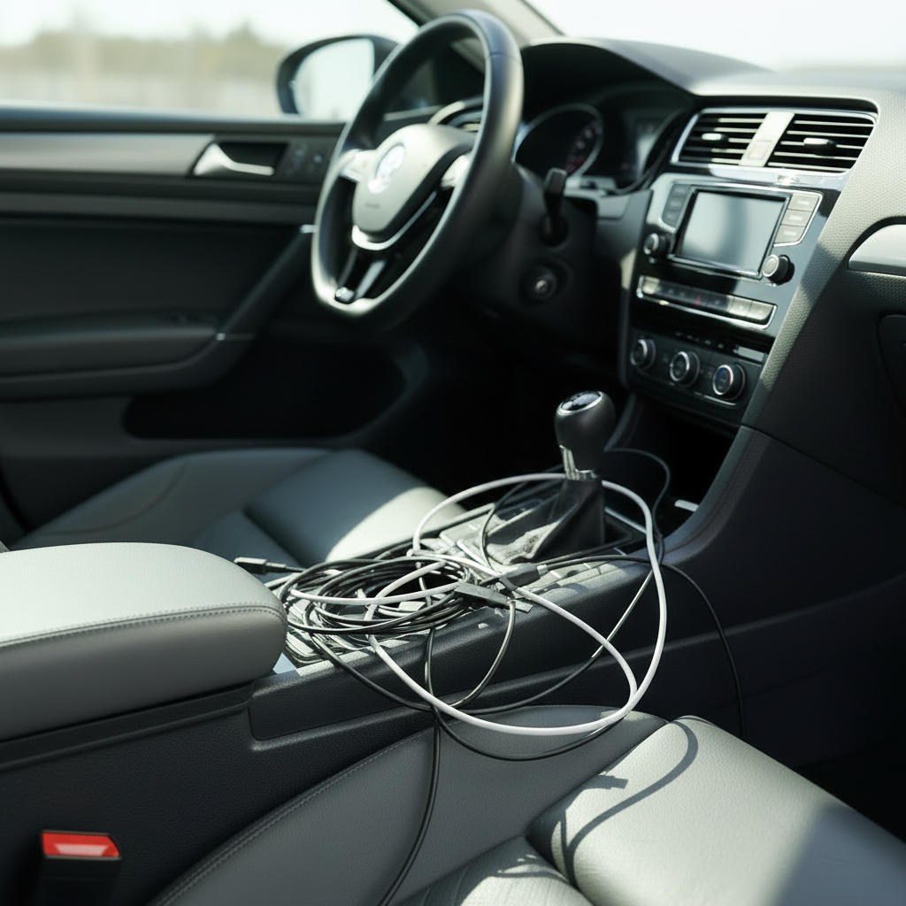 ✔︎ Integriertes Kabel mit Rückzugmechanismus – nie wieder lose Kabel im Auto